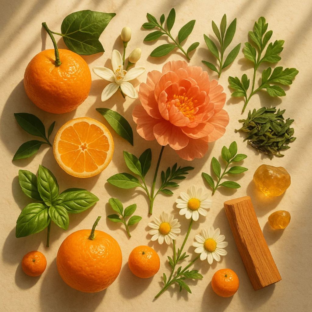 Formule_basilic_mandarine_012 - Dès les premières notes, les agrumes s’entrelacent à la fleur d’oranger pour créer une ouverture vive et lumineuse, adoucie par la fraîcheur verte du thé et du lierre. Le cœur vibrant s’épanouit dans un accord de mandarine et de basilic, relevé par la douceur herbacée de la camomille et la délicatesse florale de la pivoine. En fond, la chaleur du bois de santal se mêle à la sensualité de l’ambre.