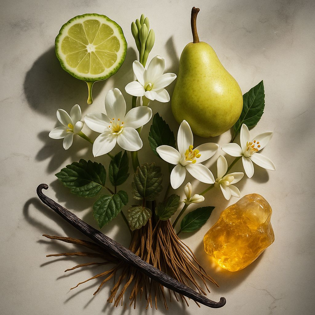 Son ouverture éclatante mêle la fraîcheur vive de la bergamote à la douceur de la poire. Le cœur floral, construit autour du nardos, de la fleur d’oranger et du jasmin sambac, exprime sensualité et élégance. Enfin, le fond riche de patchouli, vétiver, ambroxan et vanille enveloppe la peau d’une aura intense et sophistiquée.