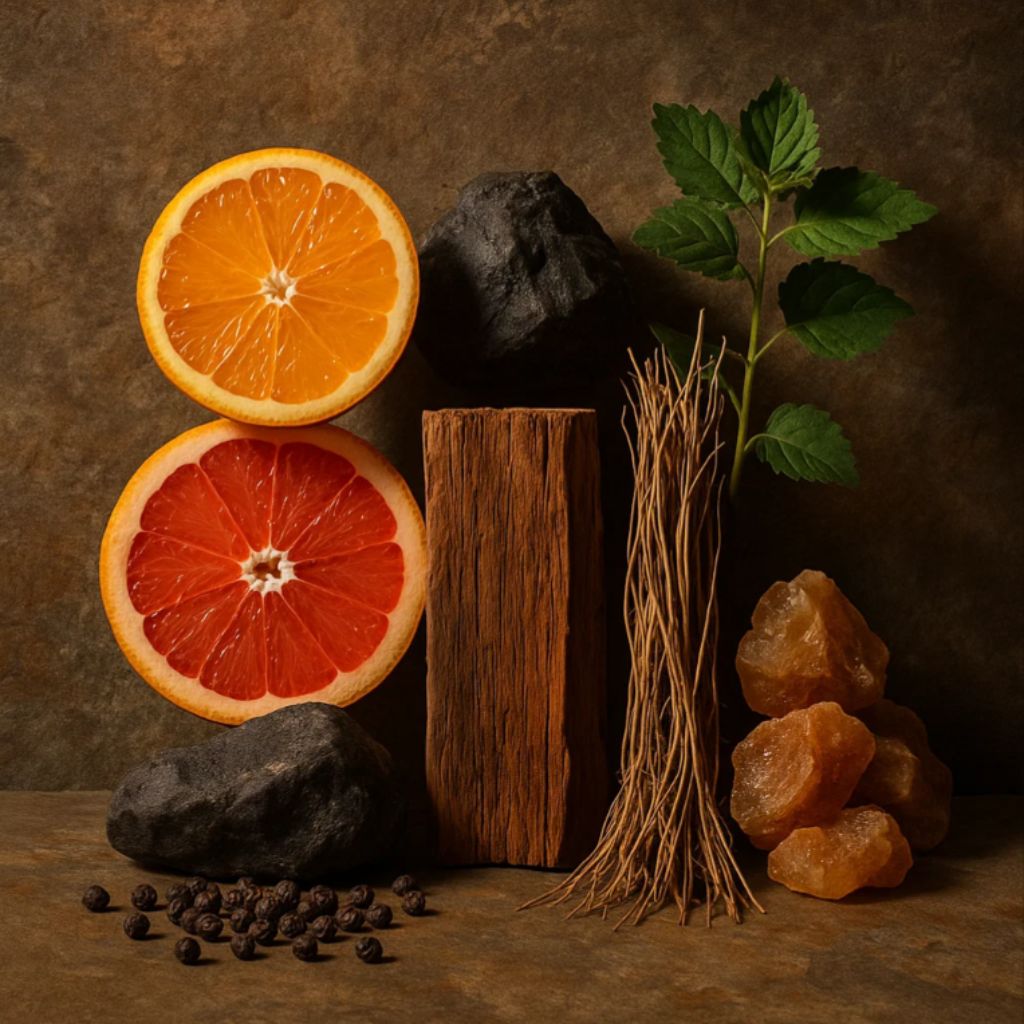 Formule_terra_502 est une fragrance minérale et boisée qui s’ouvre sur la fraîcheur vibrante de l’orange et du pamplemousse. Son cœur épicé et minéral révèle des notes de poivre et de silex, offrant une profondeur singulière. Enfin, le fond puissant et chaud, dominé par le bois de cèdre, le vétiver, le patchouli et le benjoin, incarne toute la force de la terre.